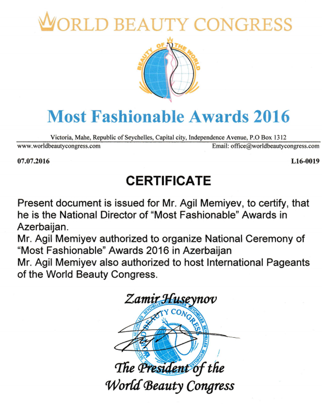 ““Most Fashionable Awards” beynəlxalq mükafatlandırılma mərasimi “World Beauty Congres”in layihəsidir. Lisenziyali formada, Azərbaycanla yanaşı digər ölkələrdə keçirilir. Mükafatlandırılma mərasiminin məqsədi, ölkənin və dünyanın ən yaxşı və ən dəbli tanınmış simalarını seçmək və reytinq cədvəli yaratmaqdır. Hazırda ölkəmizdə namizəd olmaq üçün qeydiyyat davam edir. Yalnız layihəyə uyğun gələn insanların və şirkətlərin namizədliyi qəbul olunur. Bizim mükafatlandırma mərasimində namizədlik üçün nə iştirak haqqı var, nə də mükafat ödənişli əsaslarla verilir”.