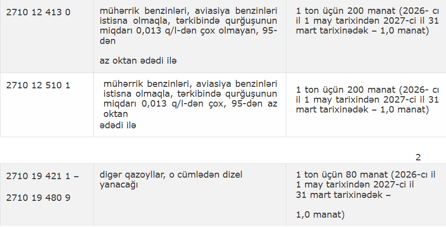 Qərara əsasən, Dövlət Neft Şirkətinin (SOCAR) 2026-cı il 1 may – 2027-ci il 31 mart tarixlərində idxal etdiyi Aİ-92 benzini və dizel yanacağı üçün müvafiq olaraq 205 min ton və 201 min ton yuxarı hədd müəyyən edilib. Həmin dövrdə ölkədə idxal olunan Aİ-92 markalı benzin və dizel yanacağı üzrə aksiz vergisi müvəqqəti olaraq hər ton üçün 200 manatdan 1 manata endirilib.