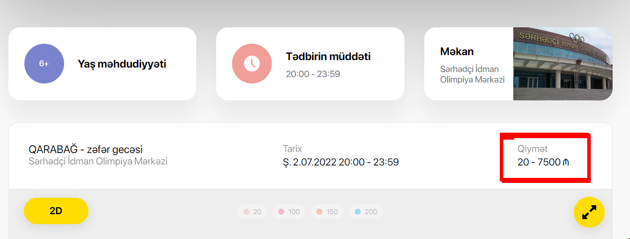 Sərhədçi İdman Olimpiya Mərkəzində keçiriləcək tədbirə biletlər 20 manatdan 7 500 manatadək satışa çıxarılıb.