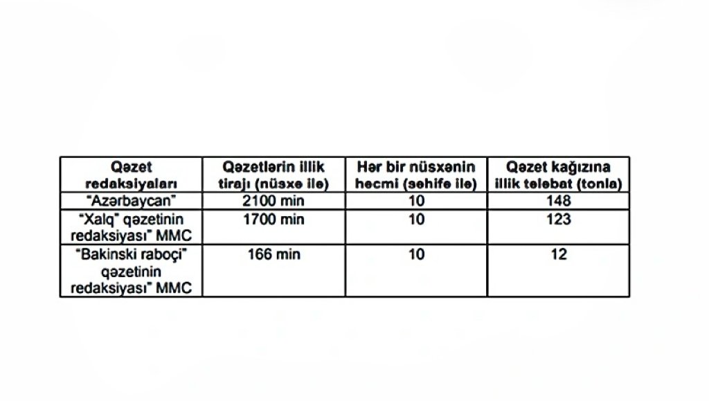 Qərara əsasən, dövlət sifarişlərinin yerinə yetirilməsi üçün "Azərbaycan" qəzeti redaksiyasına, "Xalq" qəzetinin redaksiyası" Məhdud Məsuliyyətli Cəmiyyətinə və "Bakinski raboçi" qəzetinin redaksiyası" Məhdud Məsuliyyətli Cəmiyyətinə dövlət büdcəsinin vəsaiti hesabına alınacaq qəzet kağızının norması aşağıdakı kimidir: