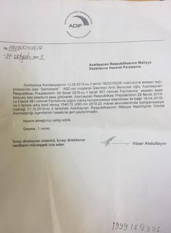Amil Qasımov bildirir ki, o hazırda fəaliyyəti dayanan “Zamin Bank”dan götürdüyü kreditə görə bu vəziyyətlə üzləşib: “Mən 2015-ci ildə həmin bankdan 5100 (beş min yüz) dollar kredit götürmüşəm. Həmin vaxt dolların kursu 1 manat 05 qəpik idi. Bunun qarşılığında mən banka borcumu artıqlaması ilə qaytarmışam. Kurs 1.70 olanda mən onlara 12.500 (on iki min beş yüz) manat qaytarmışam. Prezidentin müvafiq fərmanı çıxandan sonra bankdan mənə rəsmi sənəd verildi ki, 4588 ABŞ dolları qalığım var. Yəni həmin pul kompensasiya kimi mənə qaytarılmalıdır. Sizə təqdim etdiyim sənəddə bu öz əksini tapıb. Məhz həmin sənəddə göstərilir ki, mənim əlavə heç bir borcum yoxdur. Bunu da manata çevirəndə 7800 (yeddi min səkkiz yüz manat) edir. Mən pulu çıxarmaq istəyəndə məlum oldu ki, həmin məbləğ doğrudan da “Zamin Bank”ın cari hesabındadır, lakin bloklanıb. Get-gəldən sonra gördülər ki, mənim puldan xəbərim var. Çağırdılar məni və dedilər ki, hesab aç, ora pul köçürək. Mənim hesabıma cəmi 600 manat pul köçürdülər. Sonra isə poçt vasitəsilə ünvanıma 353 manat pul göndərildi. Səhv etmirəmsə, sonuncu məbləği Maliyyə Bazarlarına Nəzarər Palatası göndərib. Sonra Azərbaycan Əmanətlərin Sığortalanması Fondundan mənə rəsmi məktub gəldi. Həmin məktubda rəsmən göstərilir ki, Palata mənə 2619 manat ödəməlidir. Çox maraqlı vəziyyət yaranır. Mənə olan borc 7800 manatdır. Bunlar isə mənə cəmi 953 manat ödəyiblər. Müəyyən etdikləri 2619 manatı ödənilən pulun üstünə gələndə də heç mənə olan borclarının yarısı etmir. Bəs qalan pul hara getdi? Mənim ödədiyim bütün çeklərim əlimdədir. Borcum yoxdursa, niyə mənə təyin olunan kompensasiyanı tam ödəmirlər? Mənə deyirlər ki, səhvimiz olub, sənə ödənilməli məbləğ 2619 manatdır. Onu da Palata verməlidir. İş burasındadır ki, heç Palata da həmin pulu vermək istəmir. Dəfələrlə müraciət etmişəm, o pulu vermirlər. Xahiş edirəm, bu məsələnin araşdırılmasında mənə kömək edəsiniz”.