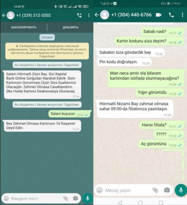 “Dələduz özünü Kapital Bankın əməkdaşı Nurlana xanım kimi təqdim etdi. Dedi ki, kartın təhlükəsizliyi ilə bağlı zəng edib. Rus dilində suallar verirdi. Mən də öz dilimizdə cavab verirdim. Gördüm, bizim dili başa düşmür. Sual etdim ki, azərbaycan dilində bilirmi? Çox güman ki, bilmirdi. Cavab olaraq “sizi azərbaycan dilini bilən əməkdaşımıza yönləndirirəm” dedi. Beləcə, başqa adamla danışmalı oldum. Bu şəxs isə özünü Kapital Bankın Təhlükəsizlik şöbəsinin əməkdaşı kimi təqdim etdi. Bir neçə dəqiqə danışdıqdan sonra anladım ki, bu şəbəkə məni aldatmaq niyyətindədir. O da mənim işin gedişatını anladığımı hiss etdi və telefonu qapatdı. Hər kəs ehtiyatlı olsun. Bakı nömrəsindən zəng gəlsə belə ehtiyatlı olun”.