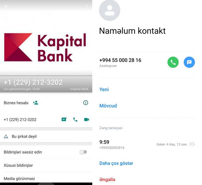“+994550002212 nömrəsindən zəng edərək özlərini Kapital Bankın təhlükəsizlik xidmətinin əməkdaşları kimi təqdim etdilər. Məndən hesabımdakı pulu sığortalamaq adıyla bütün informasiyaları aldılar. Sanki hipnoz edilmişdim. Dəfələrlə belə hadisələr barədə eşitsəm. də, buna baxmayaraaq belə bir “onlayn tələ”yə düşdüm. Hələ də şokdayam. Dərhal 196 çağrı mərkəzinə və 102-yə zəng vurdum. Lakin artıq gec idi və 3000 AZN hesabımdan çıxılmışdı”.