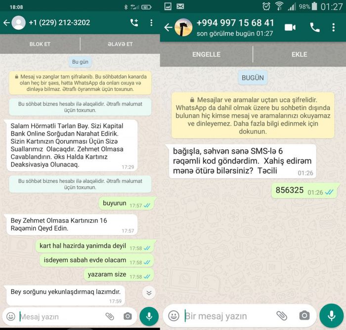 Sosial şəbəkələrdə bu cür hallarla bağlı xeyli paylaşımlar var. Əsasən “WhatsApp” sosial şəbəkəsi vasitəsilə zəng edərək və ya SMS yazıb, özlərini bank işçisi kimi təqdim edirlər. “WhatsApp” sosial şəbəkəsindəki nömrələr adətən xarici ölkələrə aid olur. Ancaq bəzi hallarda Azərbaycana aid mobil operatorların nömrələrini də müşahidə etmək olur. Maraqlıdır, bəs onlar vətəndaşların nömrə və adlarını necə öyrənirlər?