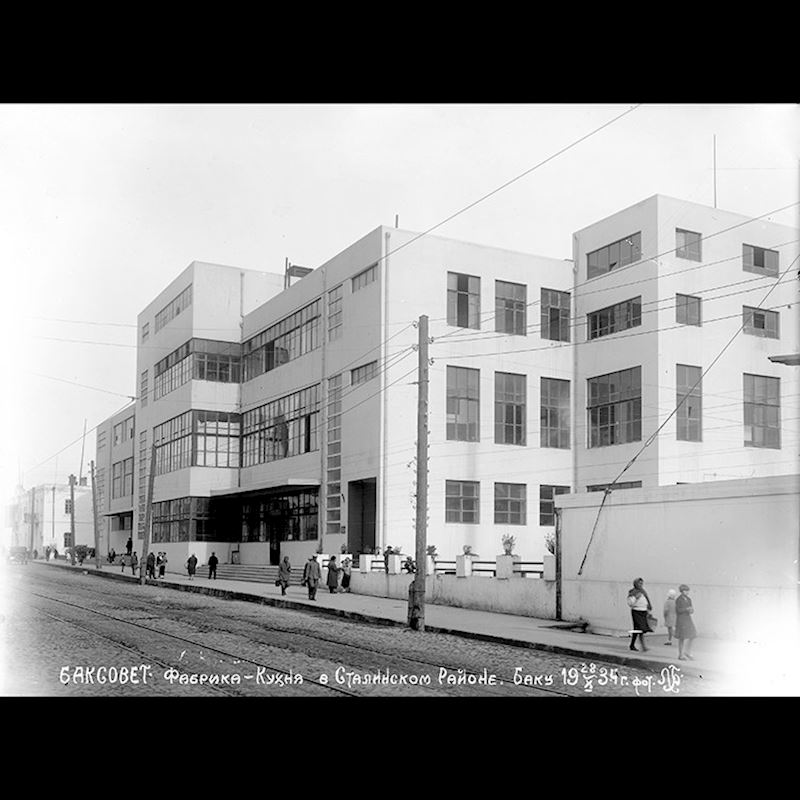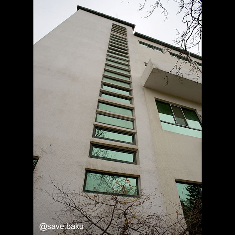 Dünya şöhrətli üçmərtəbəli bina 1931-1933-cü illərdə görkəmli Azərbaycan memarları Sadıx Ələkbər oğlu Dadaşov (15.04.1905 – 24.12.1946) və Mikayıl Ələsgər oğlu Useynovun (19.04.1905 – 07.10.1992) layihəsi əsasında tikilmişdir. Dənizə geniş mənzərəsi olan düz dam terrası yayda açıq yemək sahəsi kimi istifadə olunurdu.