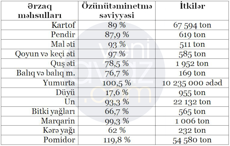 Yeniavaz.com açıqlanan rəsmi məlumatlara istinadən bildirir ki, heyvandarlıq məhsulları ilə yanaşı bitkiçilik məhsullarından olan düyü və kartof kimi əsas növ ərzaq məhsullarına olan tələbatı da yerli istehsal hesabına təmin edə bilmirik.