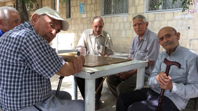 Yataqxananın qarşısında oturan bu qocalar artıq 20 ildən çoxdur ki, Bakıda yaşayırlar. Amma yenə də evlərinə, Qarabağa qayıtmaq arzusundadırlar. Səksən yaşlı Həmzə Təhməzov (ortada) deyir: “Kimi cinayət törədib həbsxanaya düşür, biz isə artıq uzun illərdir həbsxanada yaşayırıq”. Doxsan iki yaşlı Şükür Quliyev (soldan ikinci) deyir ki, yataqxanadakı bu otağı ona 1990-cı illərin əvvəlindəTəhsil Nazirliyi verib: “Burada da pis deyil, yaşamaq olar, amma bütün xəyallarımız və arzularımız doğma yurdumuzla bağlıdır”.