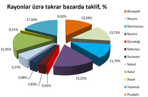 Diaqramdan göründüyü kimi, təkrar mənzil bazarında Yasamal (17,56%), Xətai (15,95%) və Nəsimi (15,25%) rayonları aparıcı mövqe tuturlar. Növbəti böyük paya malik olan rayonlar isə Nizami (13,75%), Binəqədi (13,28%) və Nərimanov (11,76%) rayonlarıdır. Təklif üzrə ən az paya sahib olan rayonlar isə Suraxanı (3,08%), Sabunçu (2,83%), Xəzər (0,51%), Qaradağ (0,45%) və Pirallahı (0,02%) rayonları olub. Həmin rayonlarda əsasən fərdi yaşayış evləri yerləşir. 5,57% payı olan Səbail rayonunda orta mərtəbəli binalar təqdim olunub, əsasən arxitektura layihələr müşahidə olunub.