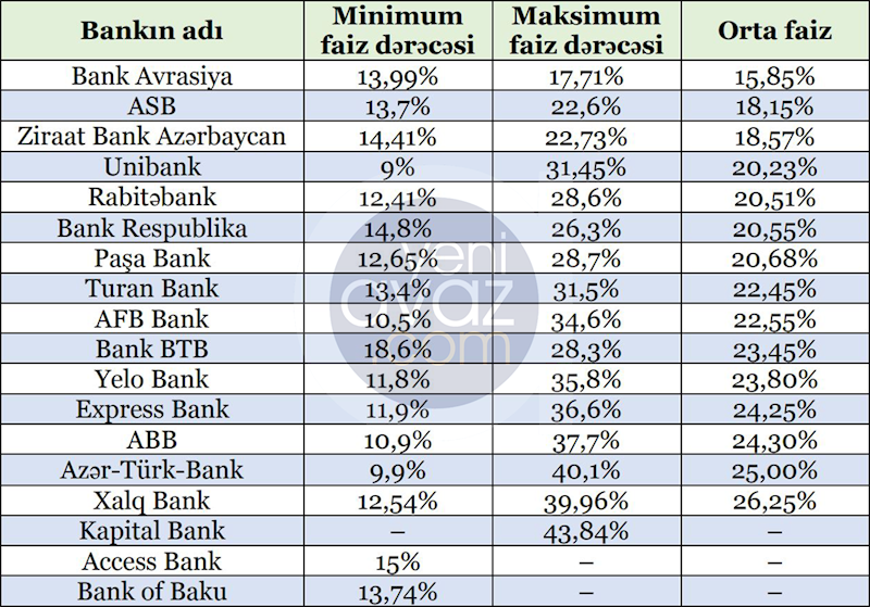 Qeyd edək ki, “Kapital Bank” FİFD üzrə minimal faiz dərəcəsini göstərməyib. Maksimal faiz dərəcəsi isə “Kapital Bank”da 43,84% olub. İki bank – “Access Bank” və “Bank of Baku” isə maksimal faiz dərəcələrini göstərməyiblər.
